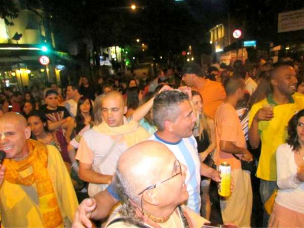 «Но самая большая харинама проходила в воскресенье 6 июля в Вила Мадалена, окрестности Сан Пауло, куда каждый день приезжает около 50000 человек», — говорит Шри Кришна Мурти. «Обычно футбольный болельщик кричит: «Эй! А!», но, когда преданные провели киртан, толпа кричала: «Эй! Харе Кришна! Эй! Харе Кришна! Эй! Харе Кришна!», — все вместе в один голос, это была фантастика. Парамагати Прабху и Бхакти Нарасимха Свами сказали, что это была лучшая харинама в их жизни».