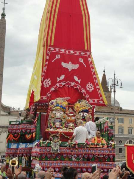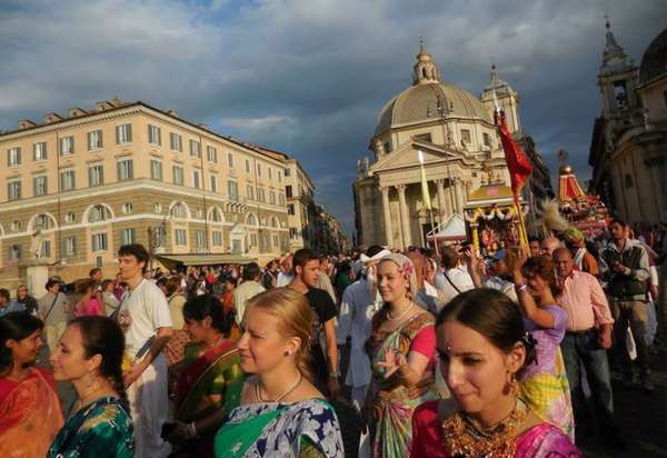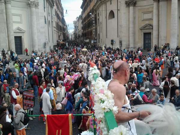 В 17.00 украшенная красно-желтым балдахином колесница сдвинулась с места, преданные везли ее вниз по Виа дель Корсо - это самое сердце Рима. Шествие открывали Шри Шри Гаура Нитай под золотым паланкином, а преданные экстатично и громко пели Святые Имена, играли на мридангах, караталах, аккордеонах, рожках и прыгали по брусчатой мостовой, а их шафрановые и белые одежды развевались. Во главе шествия слаженно танцевали девушки в ярких сари. Кстати, преданная из Запорожья Анна Михайличенко, которая отправилась с падаятрой в Италию, была в первых рядах танцующих матаджи.