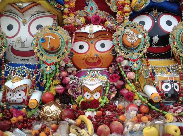 Большие Божества Господа Джаганнатха, Баладева и Субхадры приехали с Виллы Вриндаваны, а маленькие из Генуи