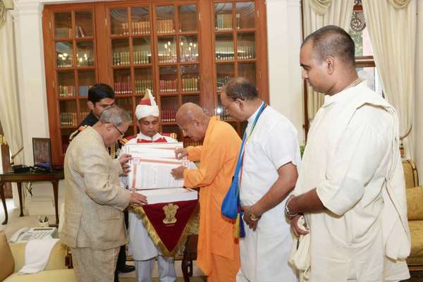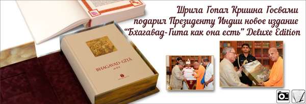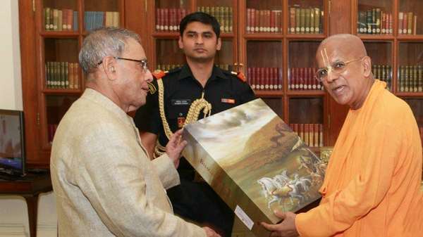 Вместе с маха-прасадом от их Светлостей Шри Шри Радха Партхасаратхи Е.С. Гопал Кришна Госвами вручил президенту Индии подарочное новое издание «Бхагават-гиты как она есть».