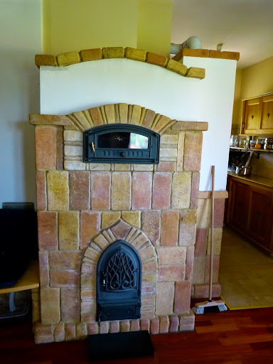 Дом отапливается двумя каминами, которые достаточно протопить один раз: благодаря тому, что он построен из пористого глиняного кирпича, — а точнее таких глиняных блоков — дом держит летом прохладу, а зимой держит тепло как термос: теплопроводность таких блоков, как вы можете сами понять, очень низкая.